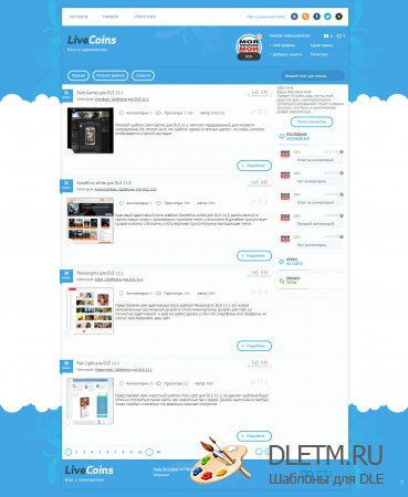 Представляем вам отличный адаптивный блоговый шаблон LiveCoins для DLE 14.1 выполненный в светлых тонах, основные цвета являются голубым и белым был создан DCOReARTs. Сам шаблон просто отличный очень удобно все сделано легкая правка нужных файлов что очень важно, также хотим отметить что данный шаблон быстро загружается так как нет посторонних скриптов или модулей что является очередным плюсом для поисковой выдачи. Присутствует верхнее меню горизонтальное меню с кнопками соц сетей, также располагается второе меню чуть ниже под самой шапкой, авторизация и меню профиля находится в шапке что является удобным для использования. Также можете посмотреть у нас и другие блоговые шаблоны для dle.