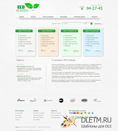 Представляем вам хостинг шаблон eco-hosting для DLE 14.3 для хостинга он выполнен в светло зеленом стиле, он довольно красивый также у него быстрая загрузка так как нет не чего лишнего, присутствует блок вывода последних новостей. Шаблон оформлен в в светлых тонах основной белый и зеленые оттенки еще он был изменен по сравнению от предыдущей версии и был улучшен и вместо картинок сделаны стили что гораздо удобнее, также были устранены все найденные ошибки и не доработки при адаптации под актуальную версию скрипта на сегодняшний день dle 14.3.